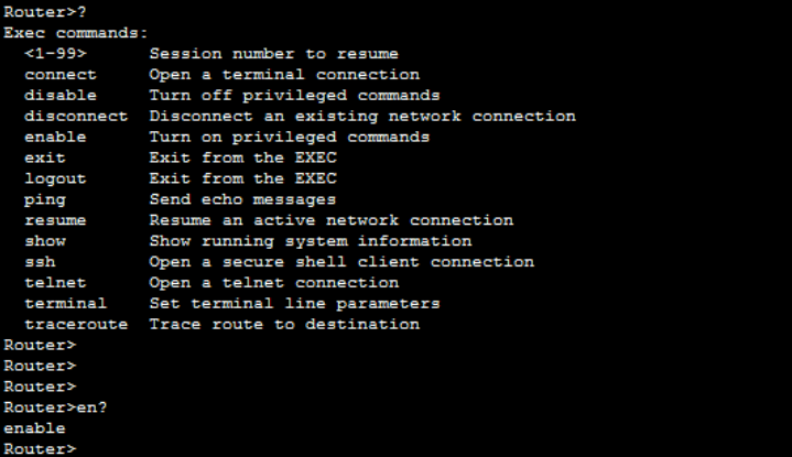 После перехода, нам доступен полный перечень команд и возможность перехода в следующие режимы без пароля. Таким образом, зная пароль на вход на устройство и пароль на привилегированный режим, человек имеет полный доступ к оборудованию, так как дальше уже никаких паролей вводить нам не требуется. Для выхода обратно в пользовательский режим используется команда disable.