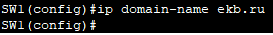 Настройка доменного имени устройства осуществляется с помощью команды (config)#ip domain name <имя>